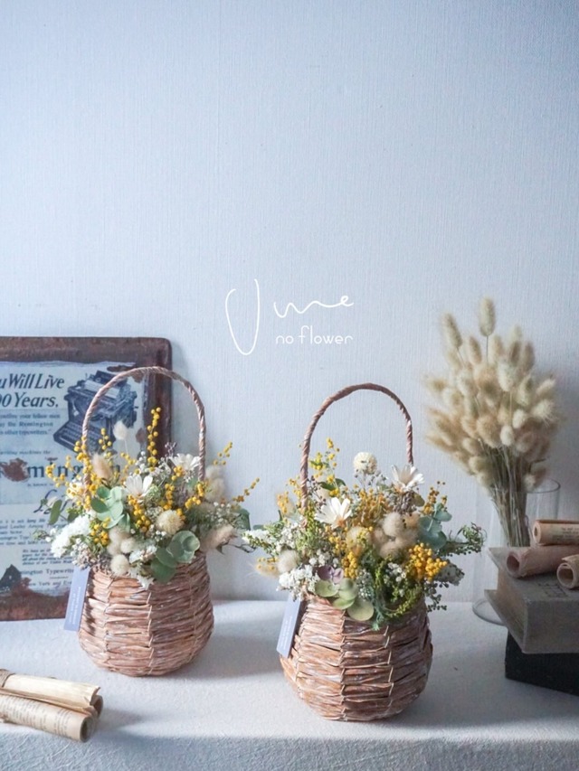 "春を告げるミモザシリーズ" 大人気のカゴアレンジ ポンと置くだけでとっても可愛い♡ ひとつひとつ、お花のクセを大切に ふんわりナチュラルにお作りしました♪ ギフトにもおすすめです♡ サイズ:高さ約28cm(持ち手含む) 【ご購入前に必ずご確認ください】 ・本商品は天然素材を使用したドライフラワーです。大変繊細なため、配送中や開封時に花びら・葉が多少落ちる場合がございます。 こちらは商品の特性であり、不良品ではございません。 ・丁寧に梱包しておりますが、軽微な折れ・欠け・花落ちにつきましては返品・交換の対象外とさせていただきます。 ・自然素材のため、時間が経つにつれてドライ化が進み状態が変わっていきますことを予めご了承ください。 ・イメージ違い、取り扱い不備等のお客様都合による返品・交換はお受けしておりません。 上記内容をご理解・ご了承のうえ、ご購入をお願いいたします。