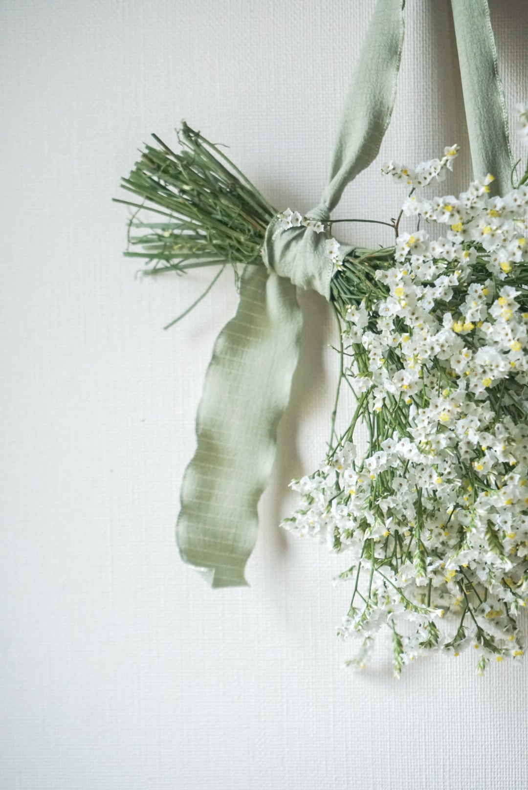 リボンにはくすみグリーンを合わせて、ナチュラルで落ち着いた雰囲気に.