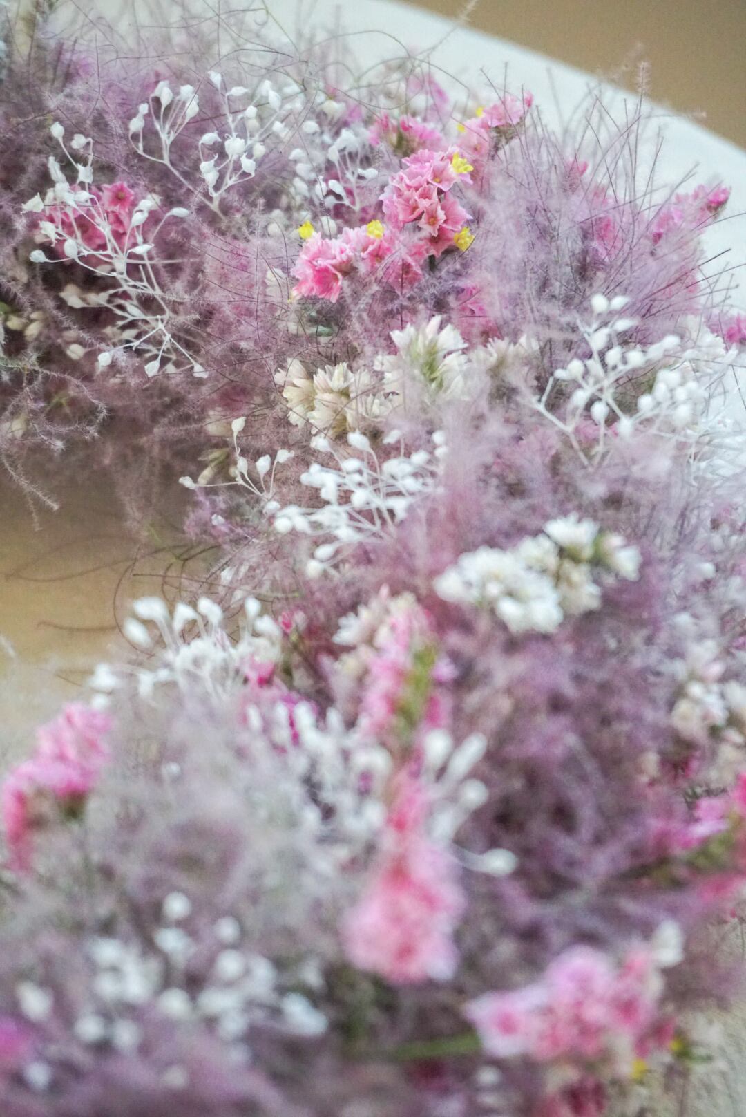ふんわりとしたくすみカラーのスモークツリーがなんとも言えない愛らしいリース.