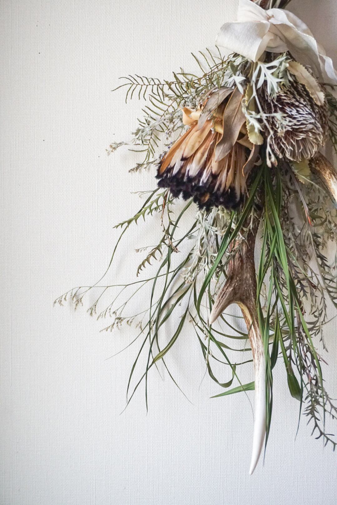 プロテアをメインにたくさんのネイティブフラワーと魔除けや勝負運などの縁起物とされる鹿の角を、ざっくりと束ねたワイルドすぎるswagが仕上がりました.